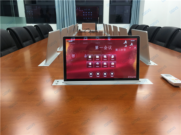 近期,重慶迅控電子科技有限公司為某高校打造無紙化會議室,根據會場實際情況以及用戶需求提供了一套智能無紙化會議室解決方案。會場主席位采用 SV-LCD17(TS)帶話筒液晶升降器;其他13個參會端采用液晶屏升降器SV-LCD17(T),產品標配內嵌式17.3英寸全高清電容觸摸屏,支持10點觸摸,即插即用,顯示屏支持0-30°后仰調節,支持自動復位。該產品是新時代無紙化會議或者視頻會議室的主流產品,配合無紙化軟件,可以實現眾多會議功能,是與會人員之間信息化交互的重要工具。